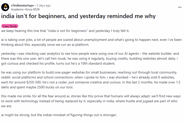 The post reads, 'We often hear the phrase "India is not for beginners," and yesterday, I truly felt its essence. AI is overtaking jobs, and many are fearful about unemployment and the future. I've also been reflecting on this, especially since we run an AI platform. Yesterday, I was checking user analytics to understand how people are utilizing our AI website builder platform.'