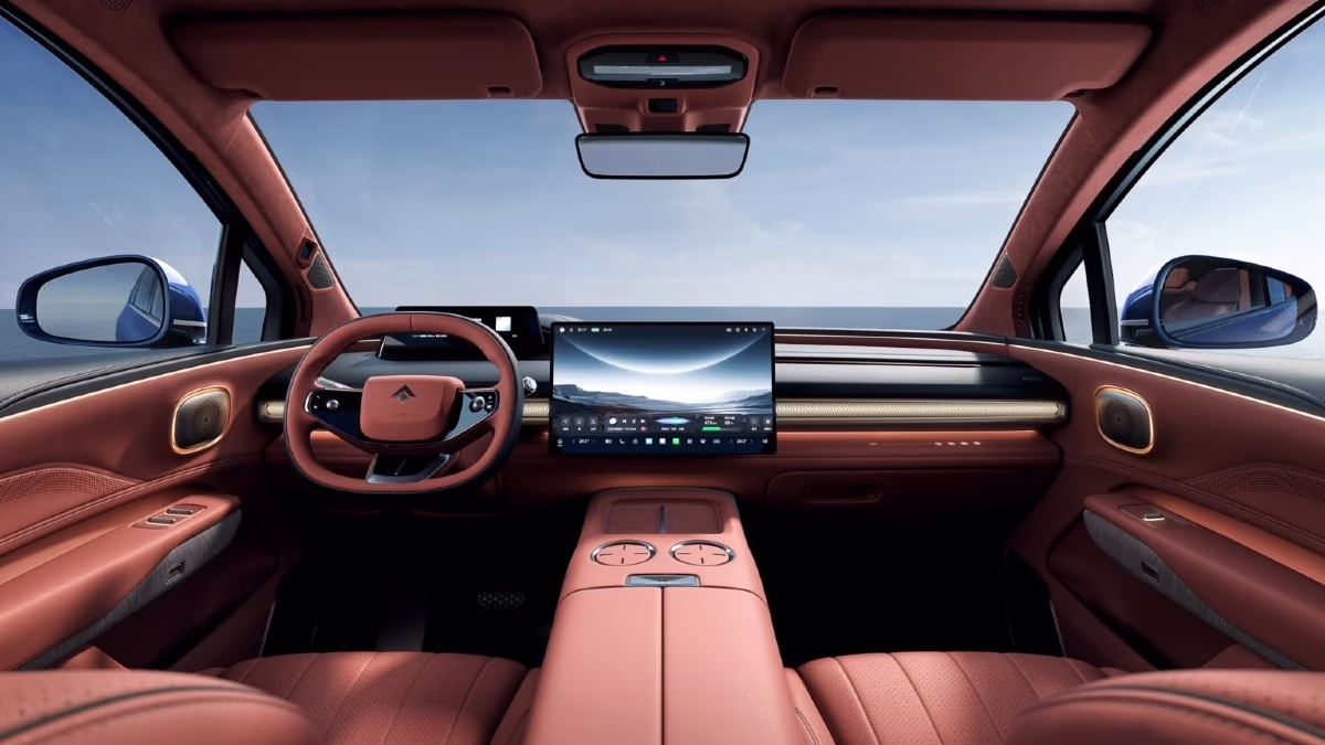 The SUV's interior features GAC's ADiGO 6.0 smart cockpit system powered by the Qualcomm Snapdragon 8295P chip, integrated with the DeepSpeak-R1 AI model for voice interaction. The cabin offers an 8.8-inch full LCD instrument panel, a 27-inch head-up display (HUD), a 17.3-inch 3K central control screen, and a 50W wireless charging pad on the center console.