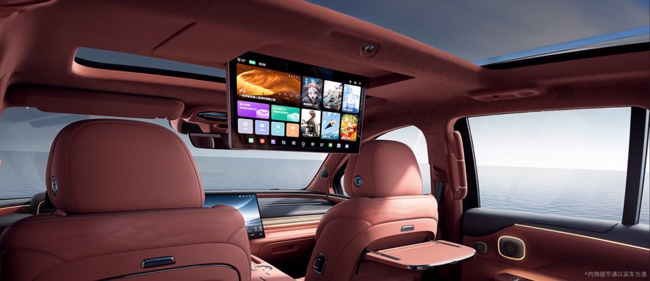 Rear passengers enjoy a 17.3-inch 3K ceiling screen and the convenience of a refrigerator. The sound system comprises 24 speakers with over 60 sound-absorbing materials and soundproof glass, ensuring a pleasurable journey. In summary, the car's cabin is exceptionally modern and smart.