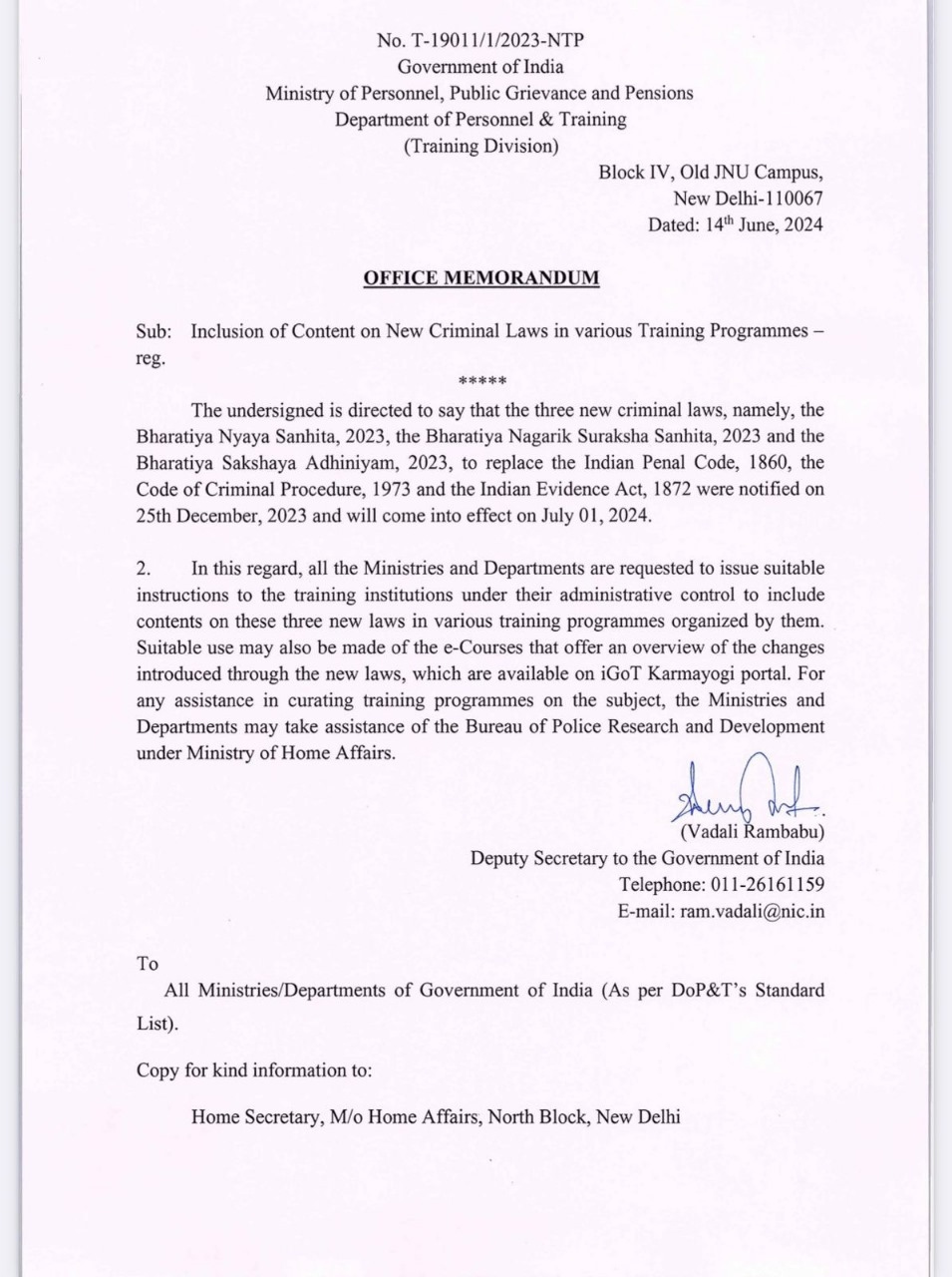 The Personnel and Training Department, in a directive to all central government Ministries and Departments, has requested the integration of content from these three new laws into their training schemes.