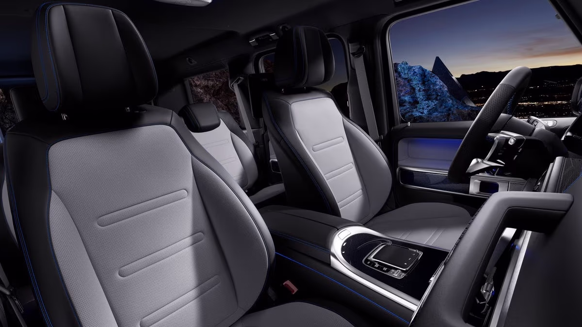 The SUV's cabin closely resembles that of the G-Class, though, as an electric model, it does feature some revamped switchgear. Mercedes Benz’s MBUX multimedia system is integrated, comprising dual 12.3-inch screens utilized for driver displays and a touchscreen infotainment unit. Beneath the touchscreen, you'll find controls for heating, ventilation, and AC.