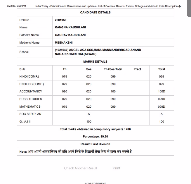 The wait is over for Rajasthan Board 12th students. Board Secretary Kailash Chandra Sharma announced the 2025 exam results today, May 22, at 5 PM. Results for Science, Arts, and Commerce streams have been released simultaneously. Anupriya Rathore secured first place with 99.60% in 12th Commerce. Kangna Kaushalani achieved 99.20% to top 12th Arts, while Preeti took first place in 12th Science with an impressive 99.80%. Below are the marksheets of these top performers.