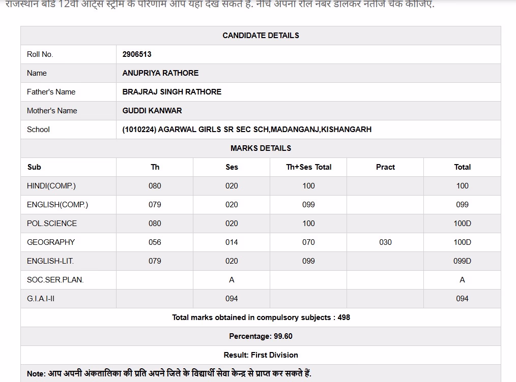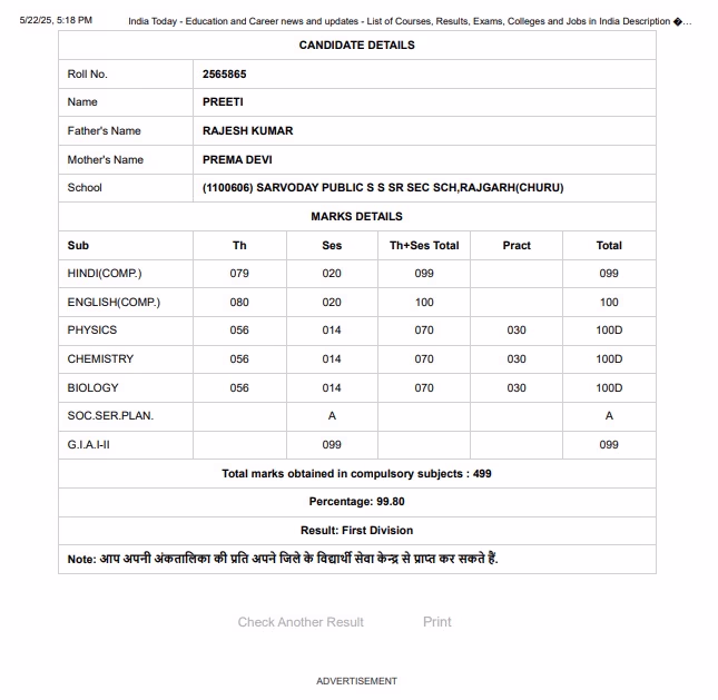 Preeti, a student of Sarvodaya Public Senior Secondary School in Rajgarh, Churu, topped the Rajasthan 12th results with an overall score of 99.80%. She lost only one mark in Hindi, scoring 99 out of 100. In English, Physics, Chemistry, and Biology, she scored a perfect 100.