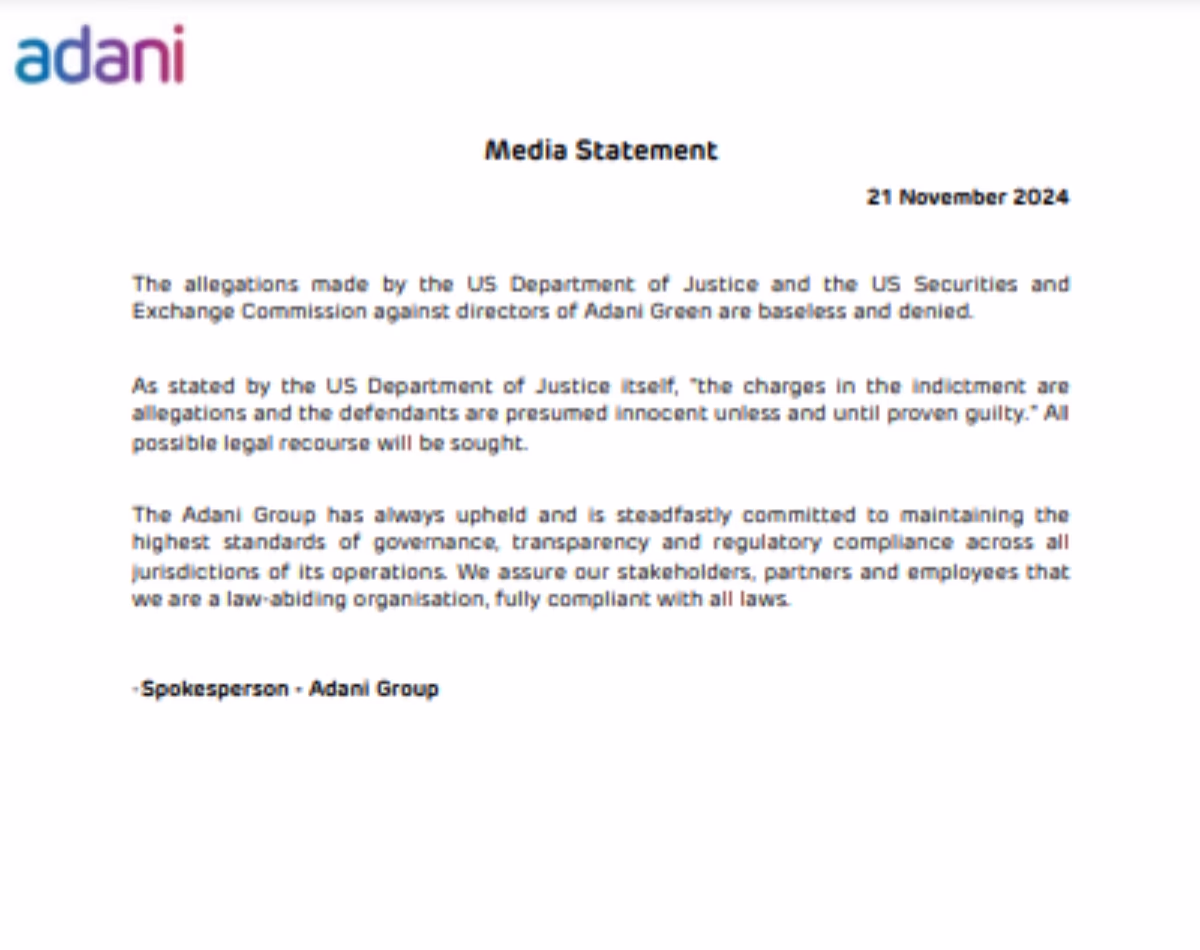 The Adani Group, led by Chairman Gautam Adani, has strongly dismissed the accusations by the US Department of Justice and SEC against him and directors of Adani Green Energy. The Group terms these allegations as completely groundless, reiterating that until proven guilty, the defendants are presumed innocent. This statement emphasizes that these claims are merely allegations and affirms that all legal options will be utilized. Assuring shareholders, the Adani Group emphasizes its commitment to transparency and adherence to regulatory standards across sectors. They promise their stakeholders and employees that they operate under full compliance with the law.