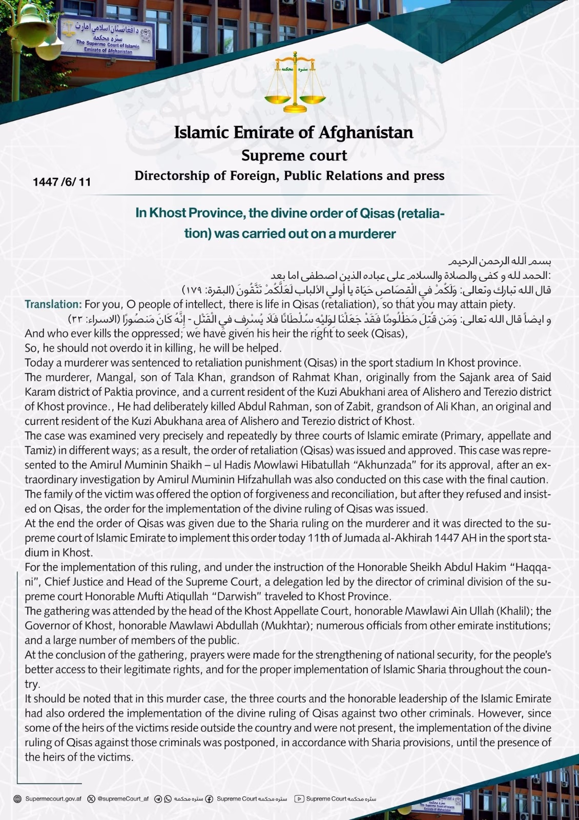 A statement from the Supreme Court explained that "Qisas," or retributive justice, was applied. The court asserted that the accused had the opportunity to appeal at all three judicial levels. However, human rights organizations cast doubt on these claims, arguing the Taliban's justice system lacks transparency and fairness.