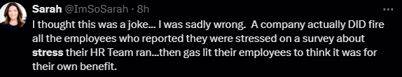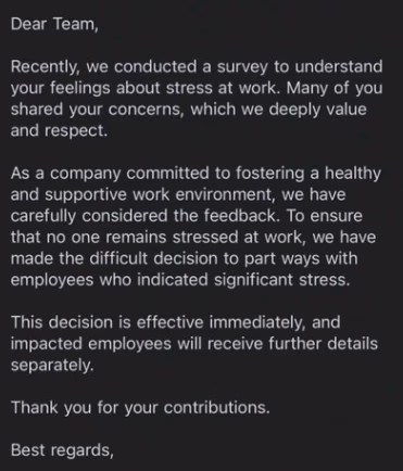 The HR email stated, 'Dear Team, recently, we conducted a survey to understand your feelings about workplace stress, during which many of you shared your concerns, which we value and respect greatly.' It further stated that, as a company committed to promoting a healthy and supportive work culture, we have carefully considered the feedback. To ensure no employee remains stressed, we have made the difficult decision to part ways with those who reported experiencing severe stress.