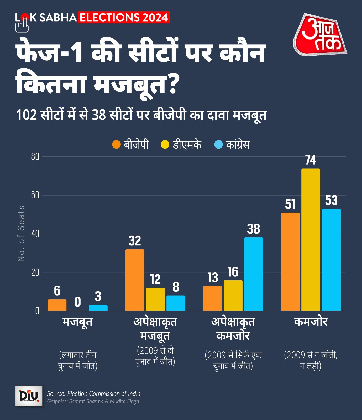 As you can see in the graphic, the BJP is strong in 6 of the seats where voting will take place in phase 1, while Congress is strong in 3. However, the DMK did not secure any seats three times in a row. The BJP is relatively strong in 32 seats, the DMK in 12 seats, and the Congress in 8 seats because they have won two elections on the same seat.