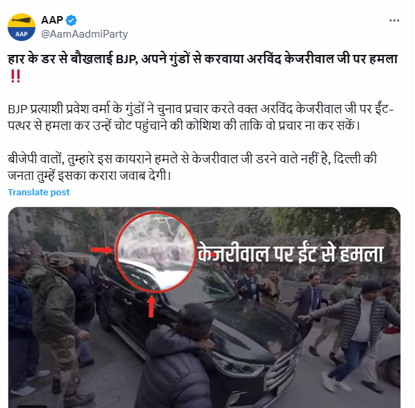 AAP shared a post on X, claiming that 'BJP is desperate due to fear of defeat. BJP instigated this attack on Arvind Kejriwal through their associates.' They accused BJP's candidate Pravesh Verma's associates of attempting to injure him with bricks and stones during an election rally to hamper his campaign efforts. AAP declared, 'BJP folks, Kejriwal will not be intimidated by this cowardly attack, and Delhi's citizens will give you a fitting reply.'