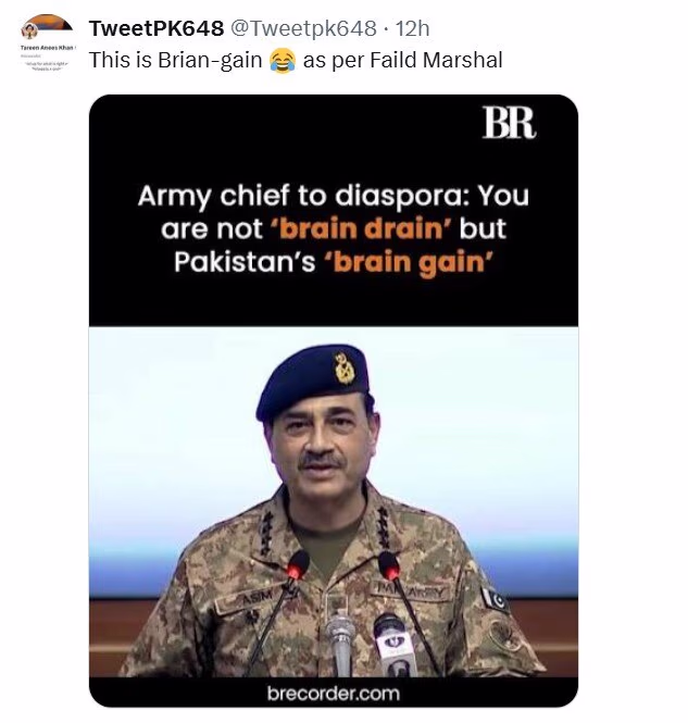 Meanwhile, data related to the exodus of doctors and engineers has sparked a storm on social media in Pakistan. Many users recalled Asim Munir's August statement where he, speaking to Pakistani expatriates in the U.S., termed the emigration of educated youth and skilled professionals as 'Brain Gain', dismissing the notion of 'Brain Drain.' Now, Munir has become a figure of mockery among the youth and educated populace of his own country. Referring to the report by Pakistan's Bureau of Immigration and Overseas Employment, an X user mocked Asim Munir, writing, 'According to this mental patient, this is Brain Gain.'