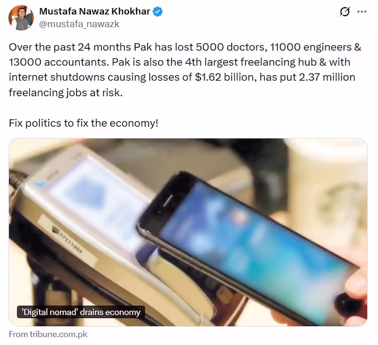 Even official statistics are refuting Asim Munir's grand statements. Former Senator Mustafa Nawaz Khokhar highlighted the report in a post on X (formerly known as Twitter), stating, 'Fix the politics, and the economy will fix itself. Pakistan is the world's fourth-largest freelancing hub, but the country faces a loss of $1.62 billion due to internet shutdowns, jeopardizing 2.37 million freelance jobs.'
