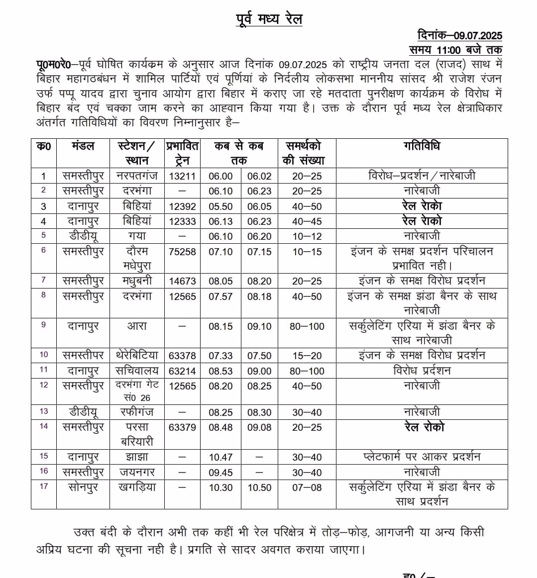 At Jehanabad's Court station, the Patna-Gaya train was stopped. Congress workers staged a sit-in on the tracks at Secretariat Halt station in Patna. In Darbhanga, the Bihar Sampark Kranti Express was halted as protesters chanted slogans on the railway tracks.