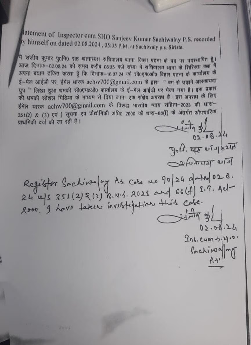 According to the police, the email arrived on the government email ID of the CMO on July 16, threatening that the CMO would be bombed. It also warned that even Bihar's Special Police couldn't prevent it, urging not to take it lightly. The email claimed to be from the Al-Qaeda group.