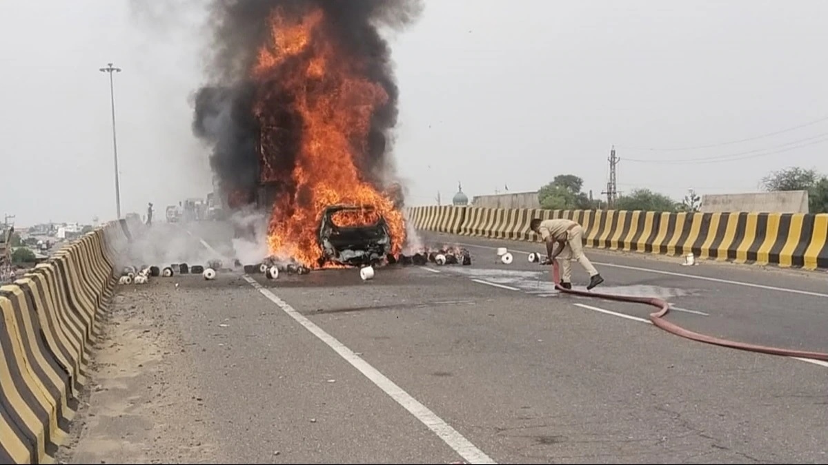In the district of Sikar, Rajasthan, a horrific accident claimed the lives of seven family members who were burned alive. The incident occurred at 2:30 PM on a Sunday when their car collided with a truck and caught fire. The blaze engulfed the vehicle rapidly, and the locked doors trapped the passengers inside.