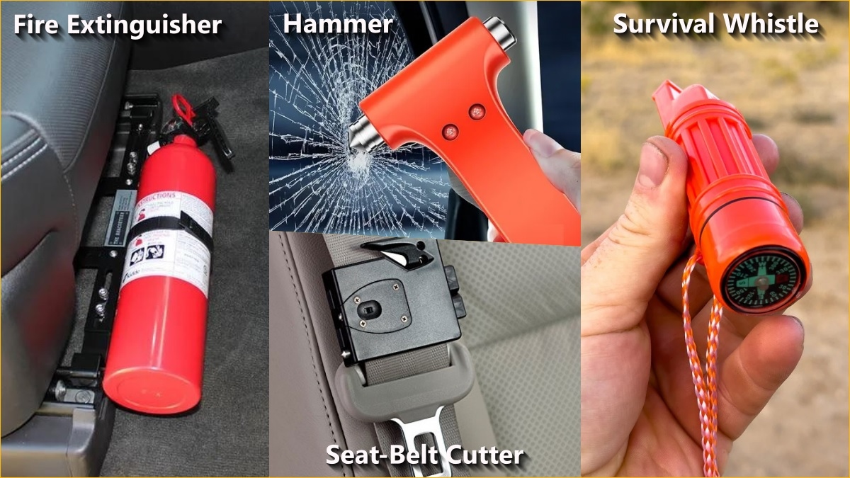 Store a fire extinguisher under your seat or near the front pillar. In the case of a fire, it can be crucial in extinguishing flames and providing a chance for escape.