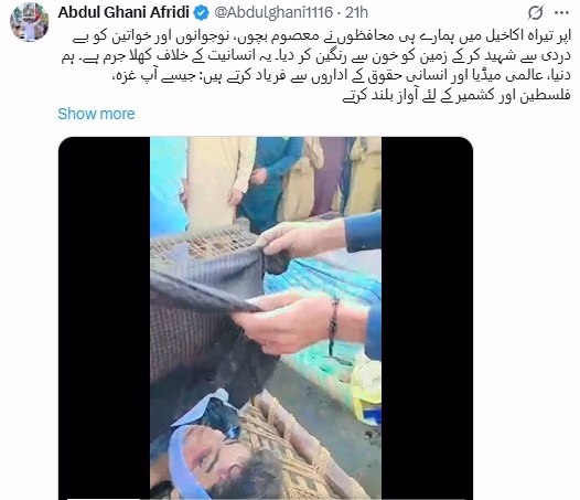It should be noted that the Afridi tribe suffered the most casualties in this attack. He presented poignant images of the attack site on X, "The Pakistani jet bombing in Upper Tirah Akakhel has triggered a mini-apocalypse. The valley where children once laughed and played is now filled with their tiny bodies. The yards where mothers wove dreams for their sons resonate today with rubble and cries. The blood of young men and the mangled bodies of innocent girls declare that no limit of oppression was spared. Were those innocent children terrorists clasping toys in their hands? Were those mothers criminals for lighting prayer lamps in their homes? No! This is sheer atrocity."