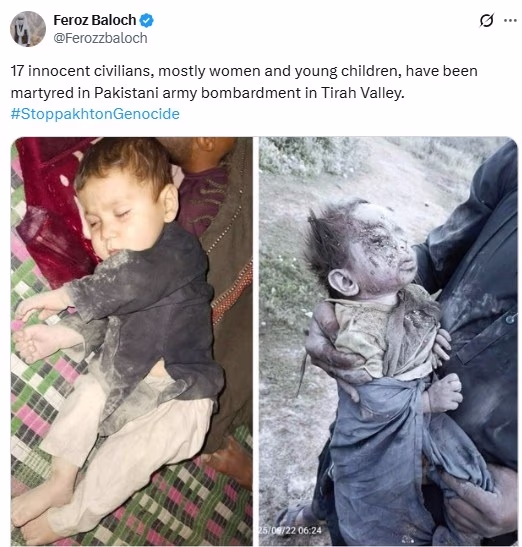 A person named Feroz Baloch, who identifies himself as a reporter in his biography and reports on human rights issues, shared heart-wrenching images of innocent children killed in the attack. These pictures serve as evidence of the Pakistani military's crimes. He wrote on X, "17 innocent civilians, mostly women and small children, were martyred in the Pakistani army's bombing in Tirah Valley."