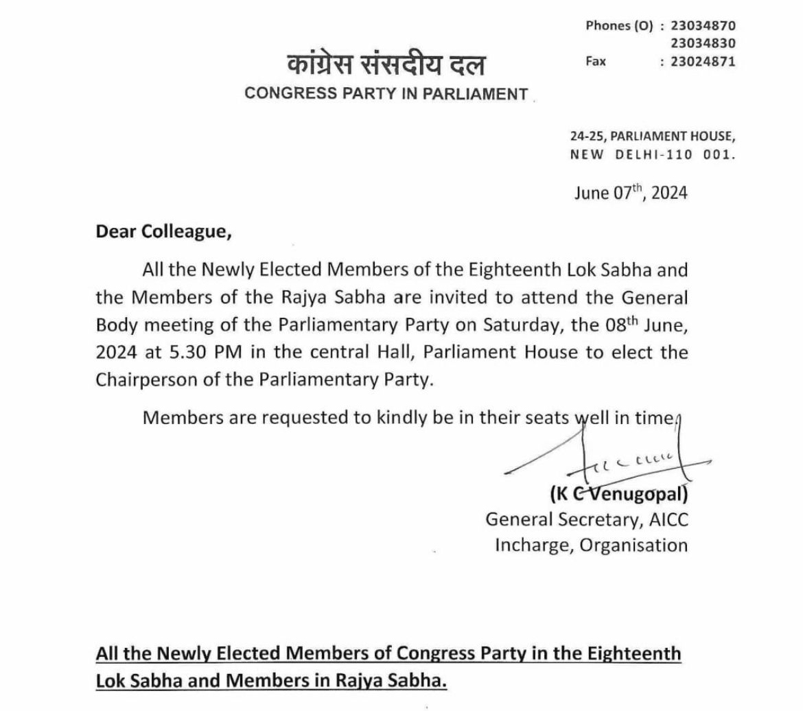 Following the Lok Sabha election results, Congress is poised to elect its chairperson. The Congress parliamentary party is scheduled to meet Saturday evening at the Parliament building's Central Hall at 5:30 PM, with all members asked to be present. It's during this meeting that the decision for the chairperson will be made. Party General Secretary KC Venugopal has issued a letter to all MPs to ensure their attendance.