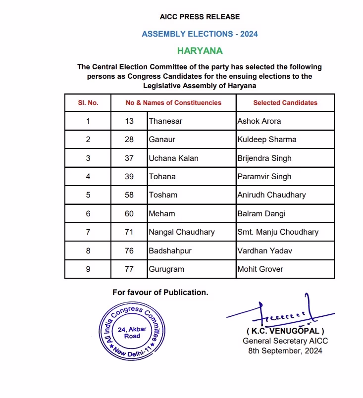 On September 6th, the Congress party had released its first list of 32 candidates for the upcoming Haryana Assembly elections. The party has fielded former Haryana Chief Minister Bhupinder Singh Hooda from the Garhi Sampala-Kiloi seat. Additionally, Surender Panwar from Sonipat, Jagbir Singh Malik from Gohana, and Bharat Bhushan Batra from Rohtak were given tickets.