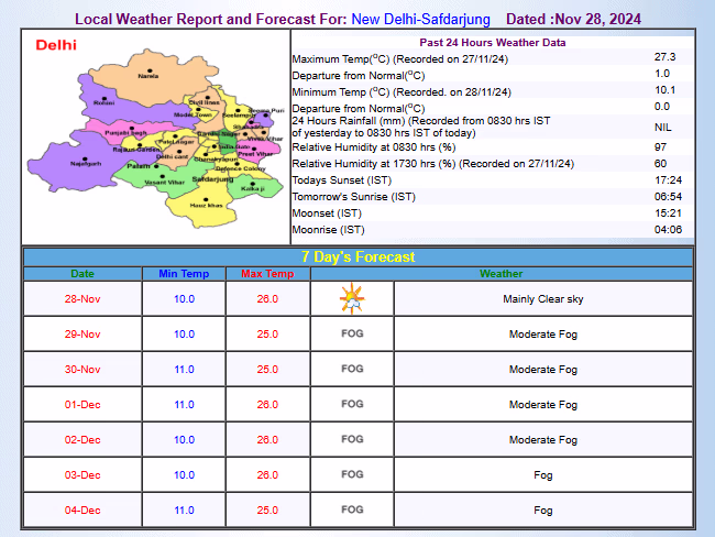 Mild fog can be observed in Delhi during morning and evening hours. According to the weather department, fog will blanket Delhi throughout the week, with the minimum temperature likely touching 10°C, enhancing cold conditions. The IMD forecasts Delhi's maximum temperature this week to hover between 25° to 26°C, with minimum temperatures around 10° to 11°C.