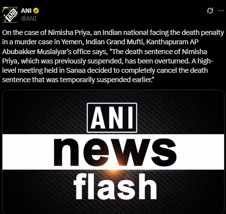 The death sentence of Indian nurse Nimisha Priya in Yemen has been entirely overturned. This breakthrough was announced by the office of India's Grand Mufti, K.T. Abubakar Musliyar. Although Yemen’s government has yet to provide official written confirmation, the statement clarifies that her previously postponed execution is now permanently canceled.