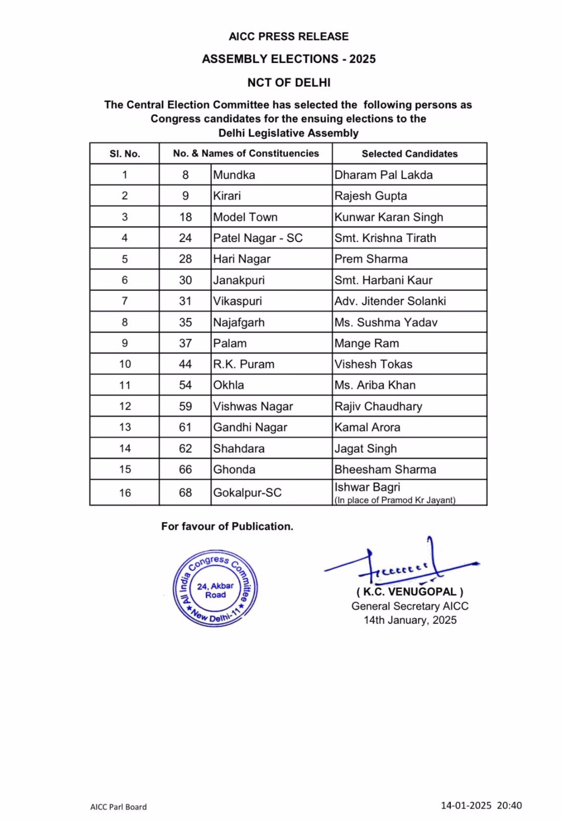 Congress has unveiled its third list of candidates for the Delhi Assembly elections. Areeba Khan has been fielded from the Okhla constituency, while former Union Minister Krishna Tirath will contest from Patel Nagar. The party has swapped its candidate for Gokalpur. To date, Congress has announced 63 candidates in total.
