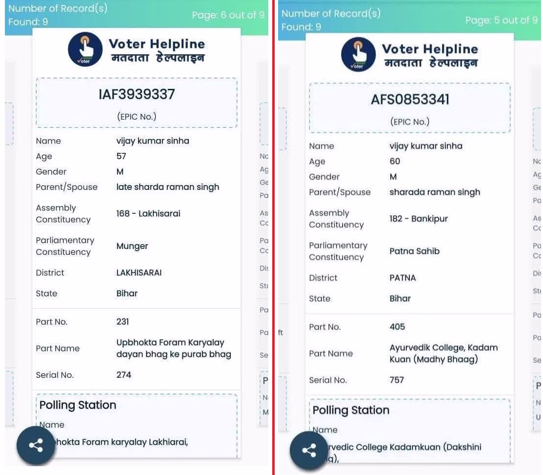Tejashwi presented the media with details of both voter ID cards belonging to Vijay Kumar Sinha and showcased the details checked online. Tejashwi asserted that Vijay Kumar Sinha's name appears in the draft voter list for both Patna and Lakhisarai, with divergent EPIC numbers and ages listed on each voter ID.