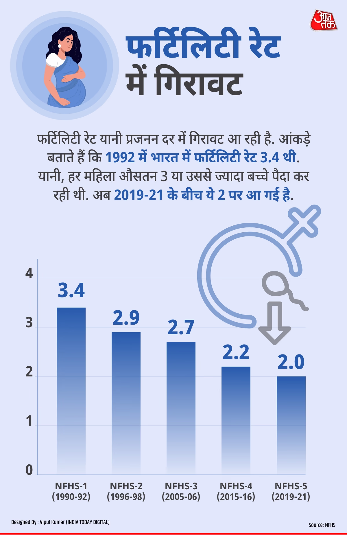 According to the National Family Health Survey (NFHS-5), India's total fertility rate decreased from 2.2 to 2.0. The total fertility rate reflects the number of children a woman is likely or expected to have in her lifetime. United Nations documents suggest the fertility rate should be 2.1 to ensure generational growth.