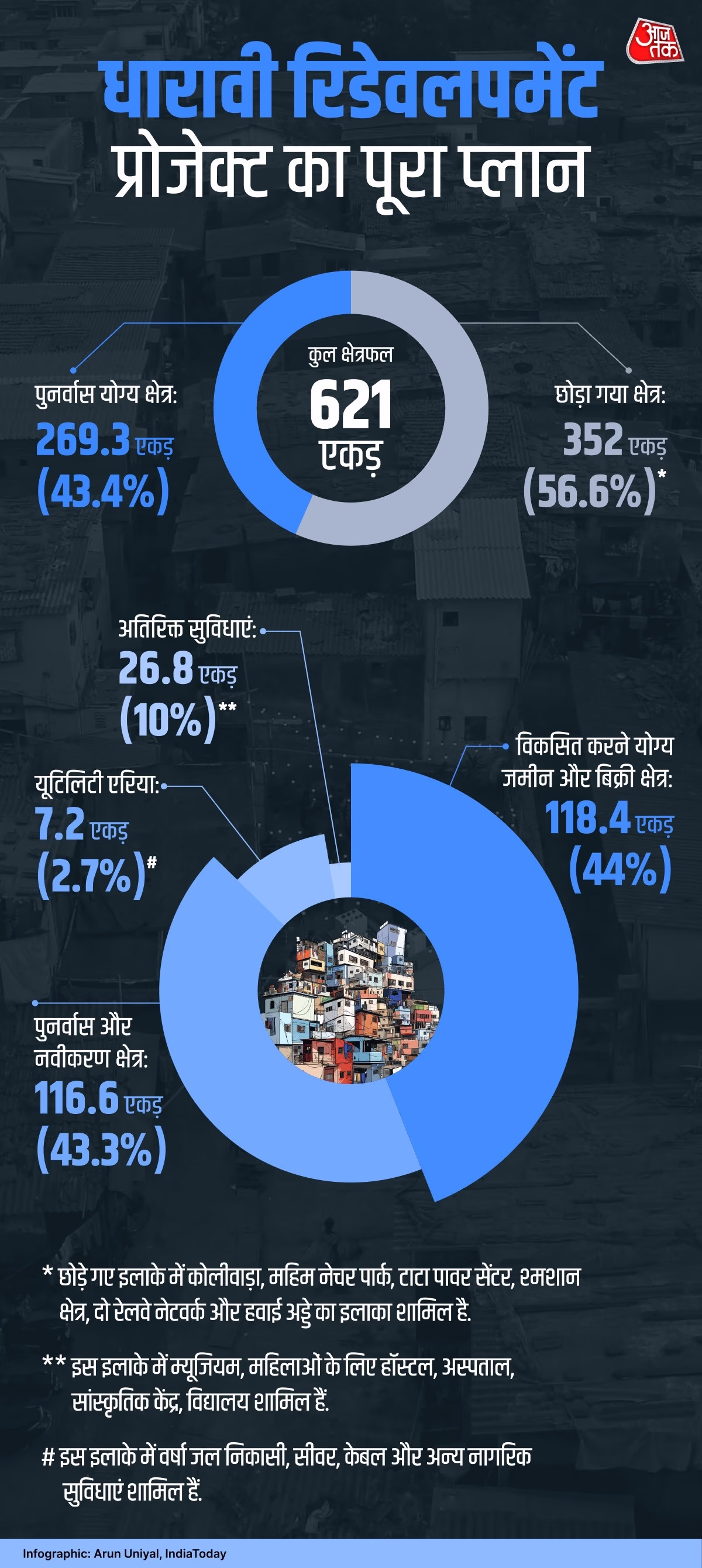 The redevelopment will affect 270 acres of Dharavi's 621-acre land, converting parts into flats, shops, and factories with additional acres for open market deals. A significant 352 acres won’t undergo redevelopment, housing parks and airports.