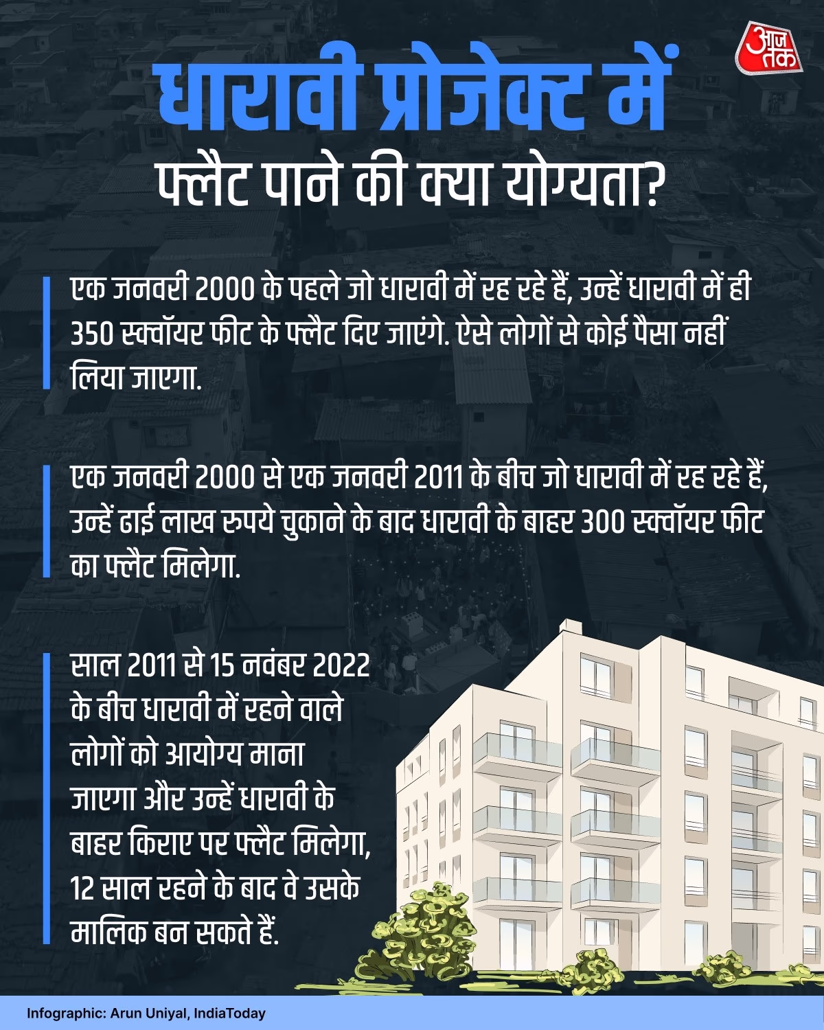 According to Maharashtra's slum law, eligible residents receive a 350 square feet flat in Dharavi, regardless of their prior number of dwellings, if they established residency before January 1, 2000. Residents from 2000 to 2011 qualify for 300 square feet flats outside Dharavi, costing ₹2.5 lakhs. Post-2011 residents are deemed ineligible but may rent flats, gaining ownership after 12 years. For provision, 256 acres in Mumbai’s eastern suburbs are allocated to NMDPL.
