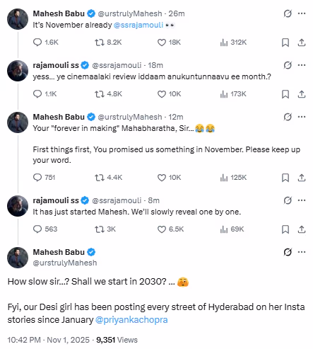 Rajamouli humorously replied, questioning which movie Mahesh wanted a review for this month. To which Mahesh Babu jested, 'Your eternal Mahabharata, which has always been in the making, sir. Please fulfill your promise made for November first.' Rajamouli reassured, 'November has just begun; everything will be revealed slowly.' Mahesh Babu humorously jibed, 'How slow? Should we begin from 2030? Did you know that our desi girl Priyanka has been posting videos of Hyderabad streets in her Instagram stories since January?'