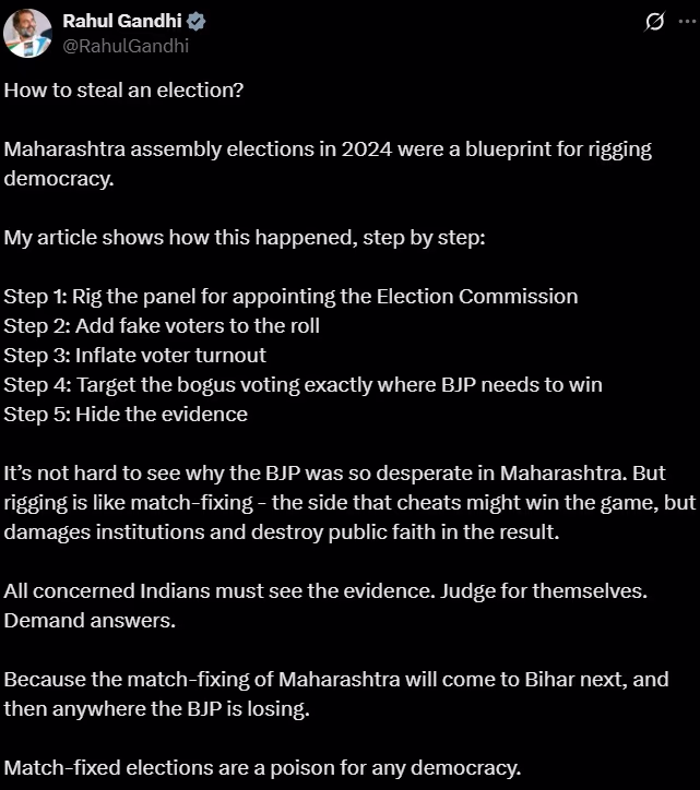 On X, Rahul wrote that the 2024 Maharashtra Assembly elections were a carefully orchestrated plan to undermine democracy. He further alleged that BJP's attention is now on the upcoming Bihar Assembly elections, slated for the end of this year.