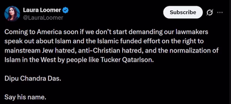 In her latest post mentioning Dipu Chandra Das, Loomer urged her supporters to pressure American lawmakers to speak openly about Islam. She warned that without concrete action, such ideas and incidents would spread from South Asia to Western countries.