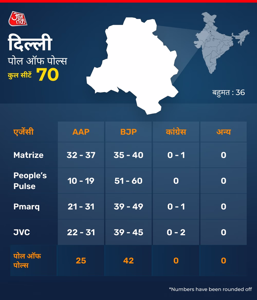 Poll Diary’s exit poll also forecasts a shift with BJP forming the government. According to this poll, AAP could take 18-25 seats, whereas BJP might win 42-50 seats; Congress is seen securing 0-2 seats.