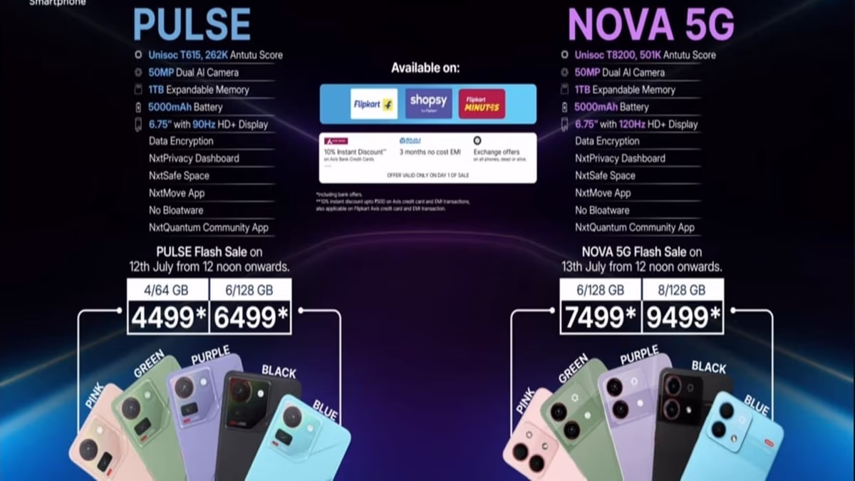 Equipped with a Unisoc T8200 chipset, the AI+ Nova 5G offers 6GB/8GB RAM options, alongside 128GB of internal storage. It supports up to 1TB via an SD card, running on Android 15 based NxtQuantum OS.