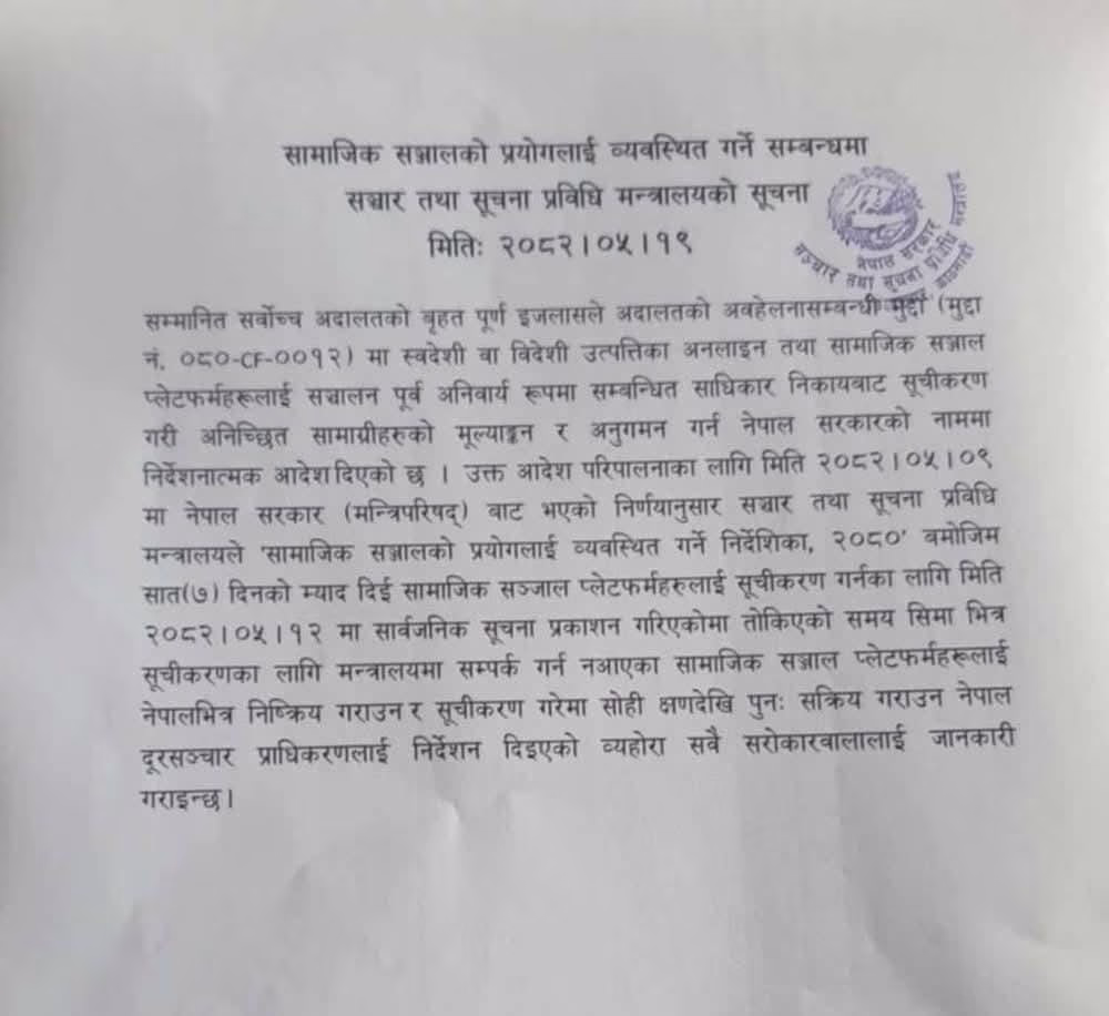 The Nepal government has decided to ban social media platforms that have not registered with the Ministry of Communication and Information Technology. This decision came today, Thursday, during a meeting led by the Communications Minister, Prithvi Subba Gurung. The platforms had been given a seven-day deadline for registration, which has now expired.