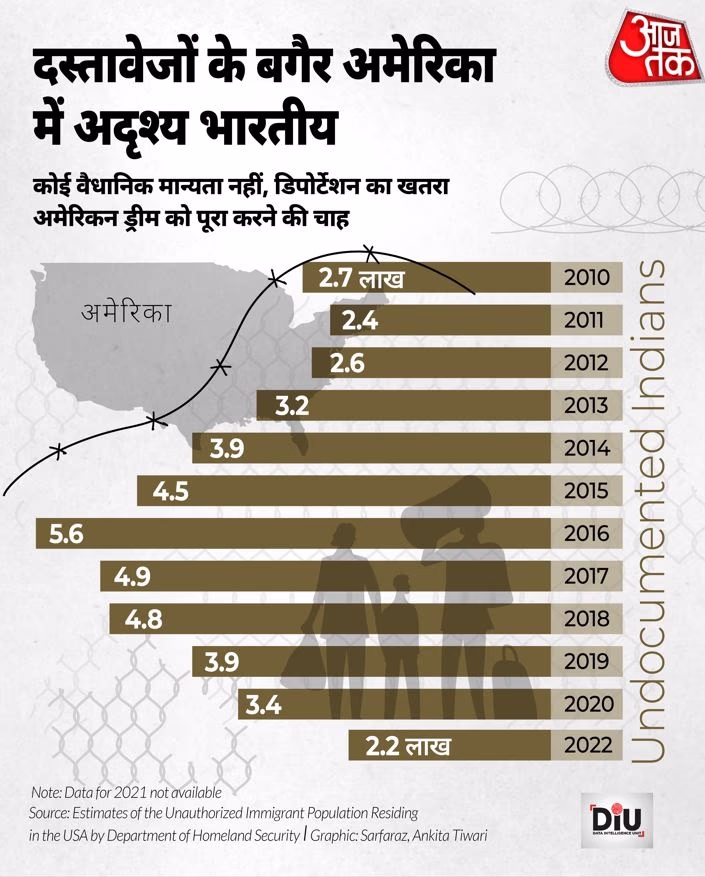 A report from the Department of Homeland Security reveals that in 2022, there were 11 million people living as illegal immigrants in the US, predominantly hailing from Mexico, Guatemala, El Salvador, and Honduras. Looking at India, the illegal immigrant population decreased from 480,000 in 2018 to 220,000 in 2022, a reduction of 54%.