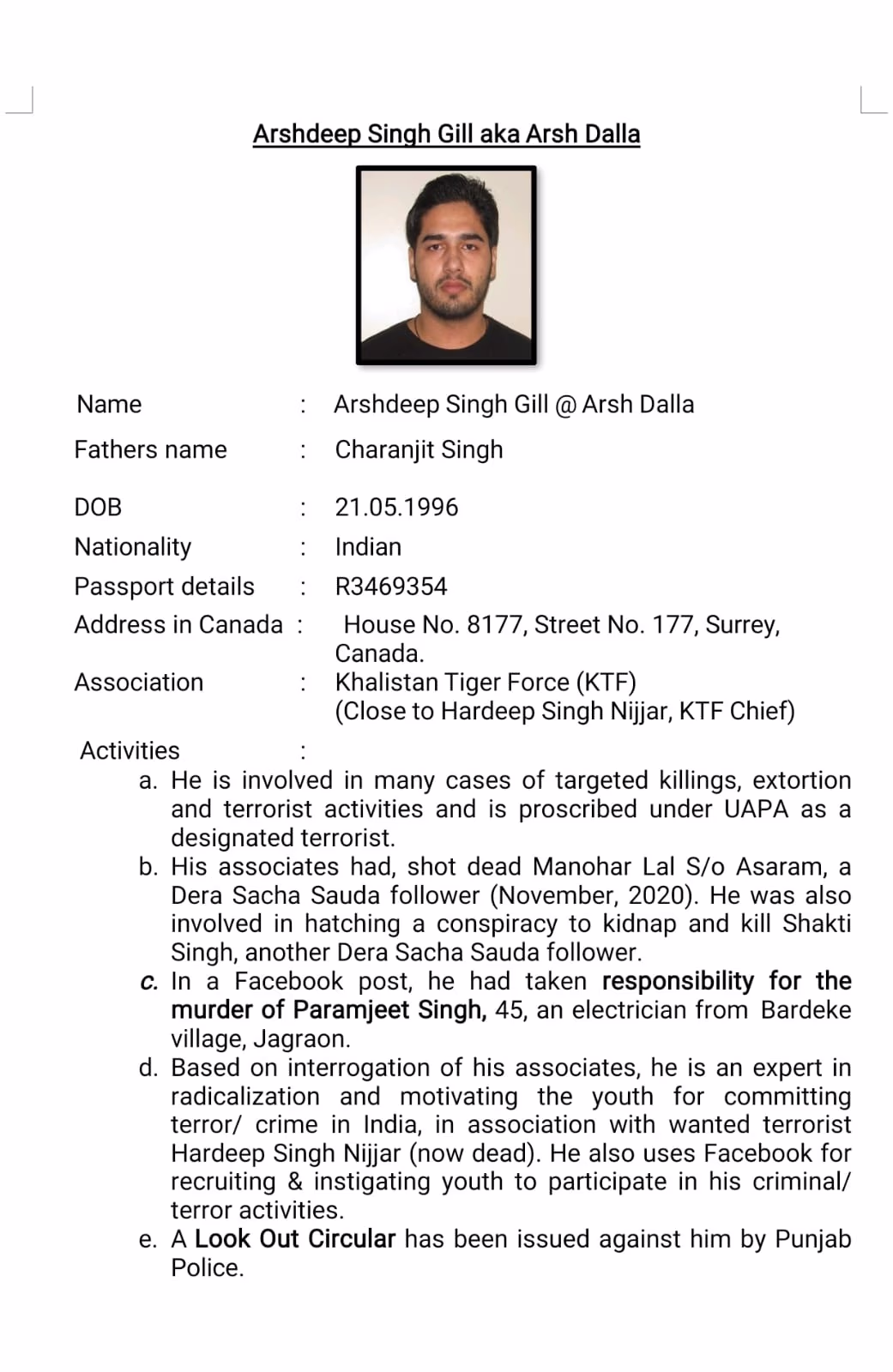 Consequently, the Indian Home Ministry has declared him a terrorist under the Unlawful Activities (Prevention) Act. The NIA has designated him a fugitive, placing a bounty of five lakh rupees on his head. Despite Nijjar's death, Arsh Dalla maintains strong ties with notorious gangster Lawrence Bishnoi and his friend Goldy Brar, who are described as being close associates.