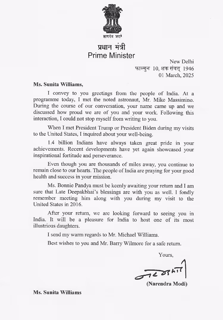 PM Modi penned this letter to Sunita Williams on March 1, expressing his hopes for her safe return and referring to her as 'India's Daughter.' The letter was conveyed through renowned astronaut Mike Massimino and has been proudly shared by Union Minister Jitendra Singh.