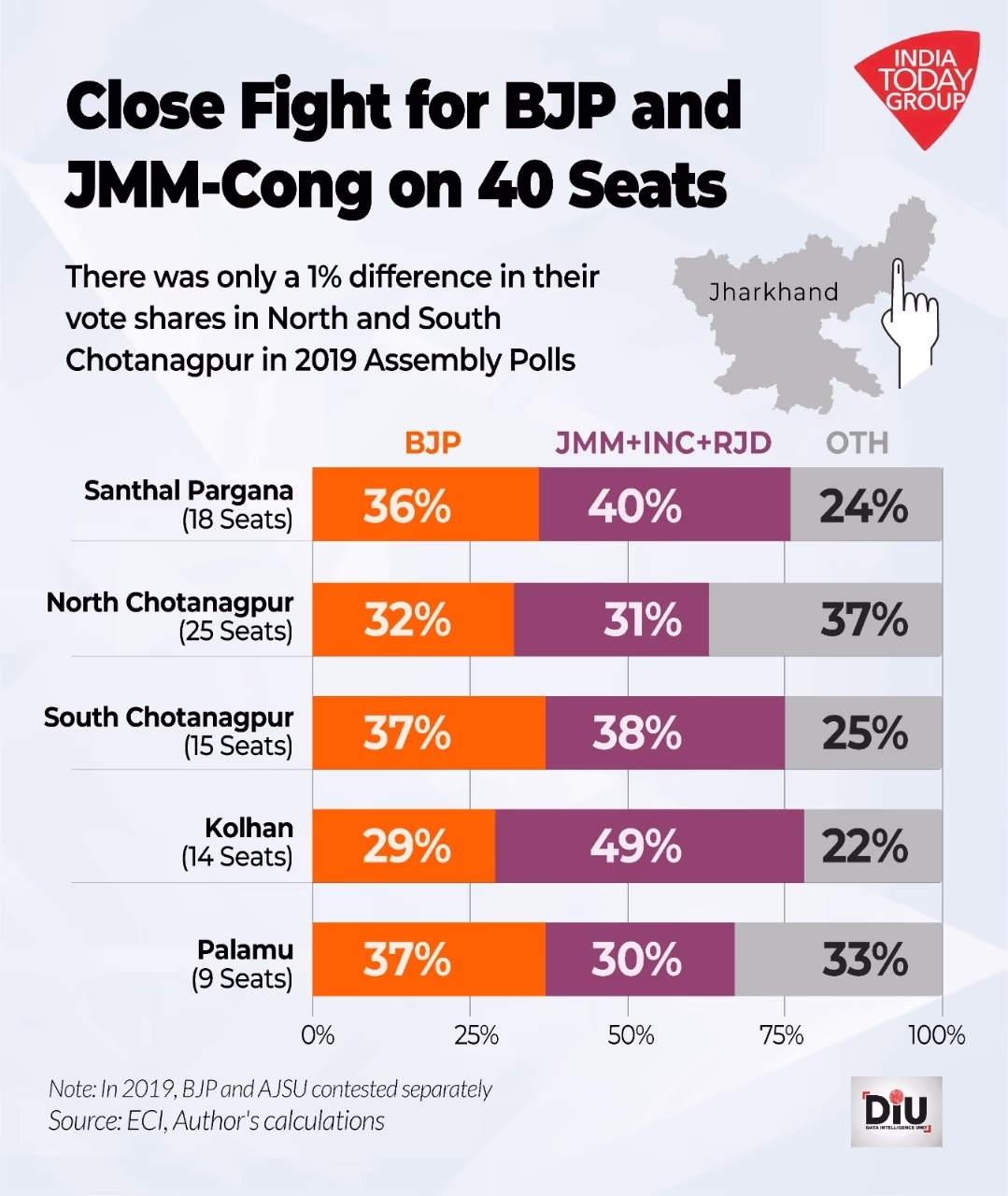 For electoral analysis, Jharkhand can be divided into five regions: Palamu, Santhal Pargana, North Chotanagpur, South Chotanagpur, and Kolhan. Palamu has 9 seats, Chotanagpur has 40 seats combined (North and South), Santhal Pargana has 18 seats, and Kolhan comprises 14 seats. In the state, 9 seats are reserved for Scheduled Castes and 28 seats for Scheduled Tribes.