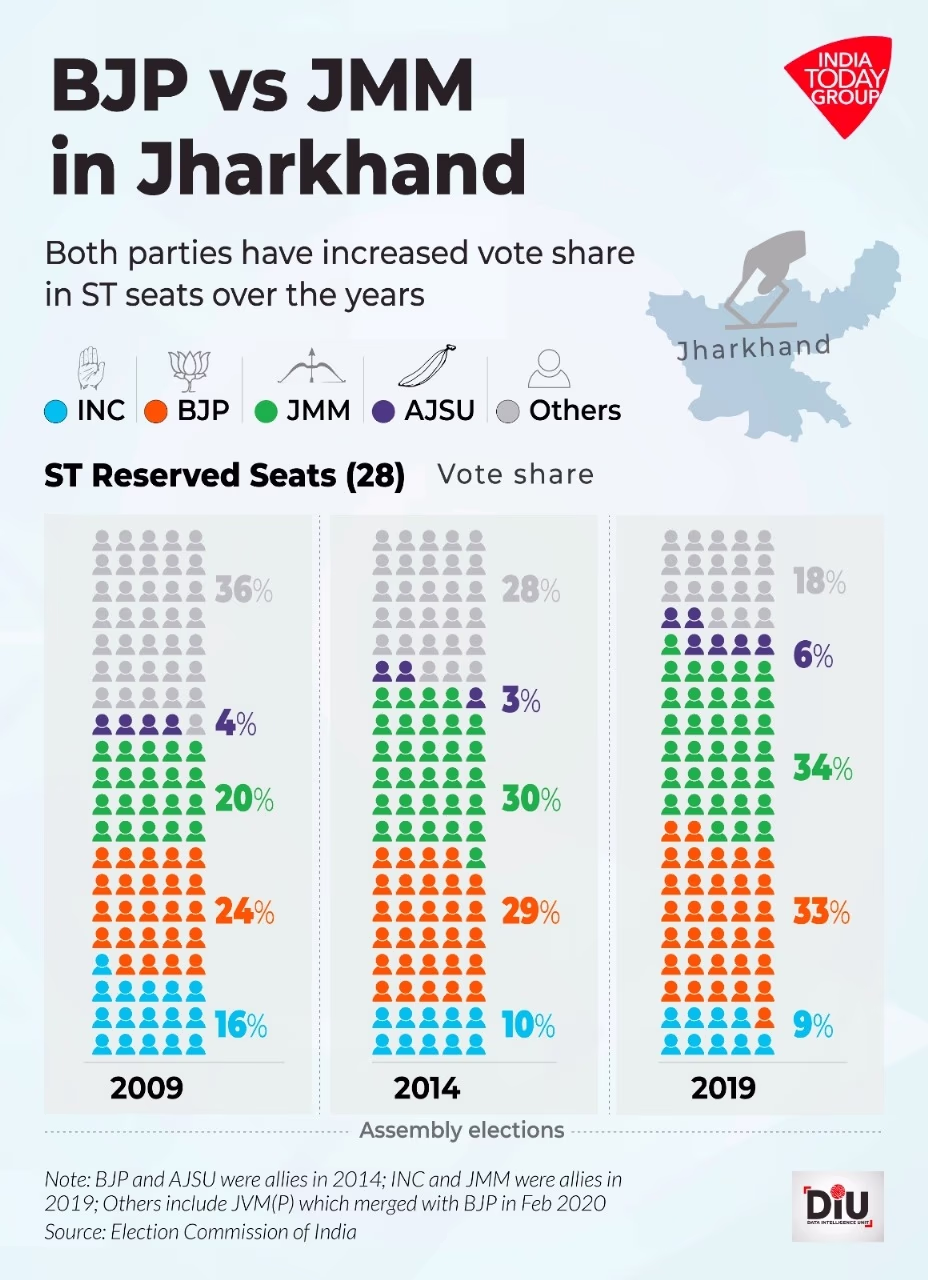 BJP has consolidated its hold on Scheduled Caste seats, while JMM's grip has strengthened on Scheduled Tribe seats. South Chotanagpur has 11 Scheduled Tribe seats, Kolhan 9, Santhal Pargana 7, and Palamu just 1. North Chotanagpur lacks any seats reserved for Scheduled Tribes. Four Scheduled Caste seats are in North Chotanagpur, two in Palamu, and one each in South Chotanagpur, Kolhan, and Santhal Pargana. Scheduled Castes comprise about 12% and Scheduled Tribes about 26% of the state's total population.