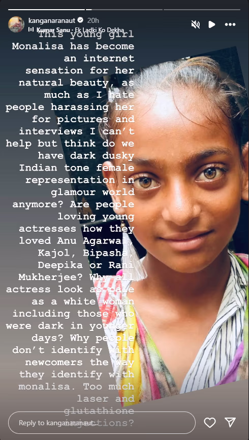 Now, Kangana has shared a story lauding Monalisa, mentioning – this young girl Monalisa has become a social media sensation for her natural beauty. Although I don't appreciate people bothering her with photos and interviews, I can't help but wonder, is there still a representation of dark-skinned Indian women in the glamour world?