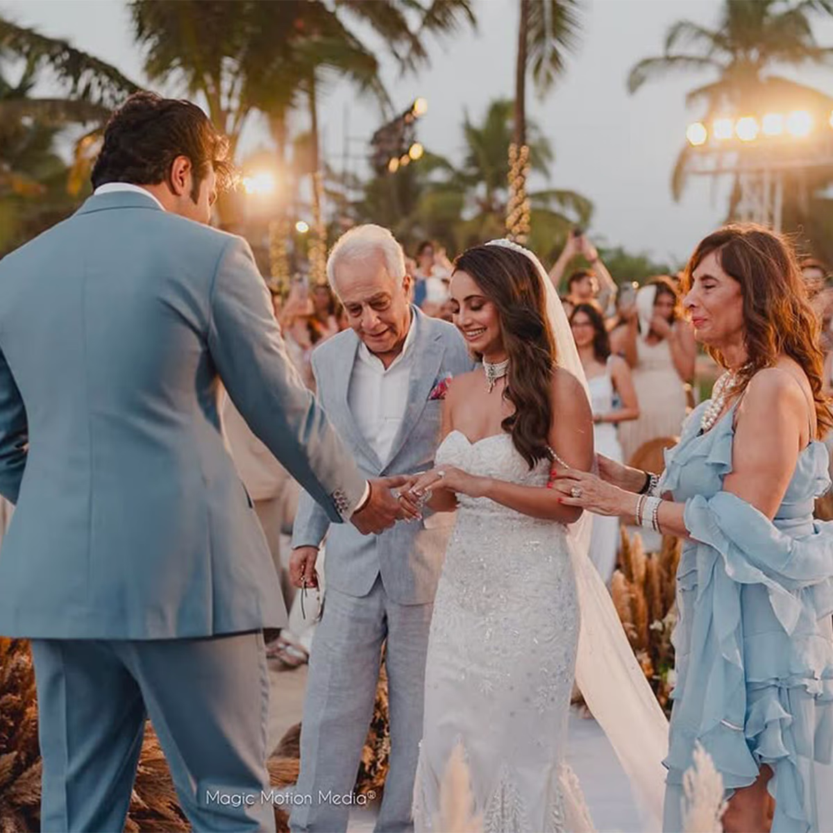 As the sun set on the beach, they shared a passionate kiss. Aadar's parents, Reema and Manoj Jain, beamed with joy and love for their son's happiness.