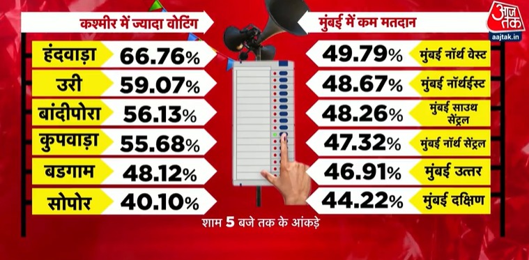 West Bengal reached the highest with 73.14 percent, while Maharashtra had the least at 53.51 percent. Voter turnouts in Mumbai's constituencies ranged from 46 to nearly 54 percent. According to the Election Commission's Voter Turnout app, Thane registered 49.81 percent voting.