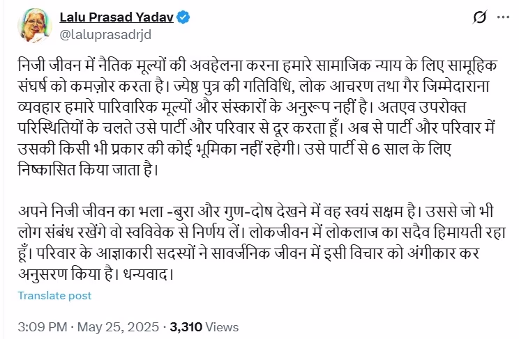 Lalu Yadav stated, "Ignoring moral values in personal life undermines our collective fight for social justice." The eldest son's actions, his demeanor in public, and his irresponsible behavior do not align with our family values and traditions. Consequently, given these circumstances, I am distancing him from both the party and the family. From now on, he will have no role in either," concluding his decision to expel Tej Pratap from the RJD for the next six years.