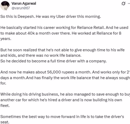 The inspirational story of a Bengaluru Uber driver has become a topic of conversation on social media. Businessman Varun Agrawal shared a post on X, narrating the story of Uber driver Dipesh. This story stands out because it showcases a person who prioritized family over money and took control of his life's direction.