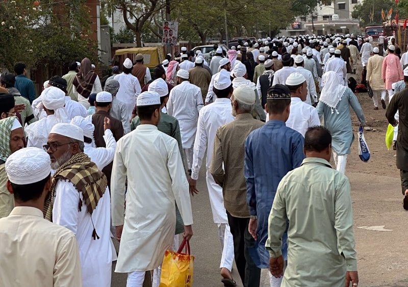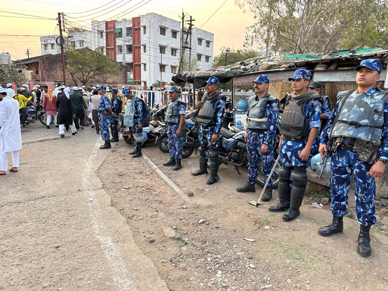 Bhopal has enforced stringent security measures for Eid. Armed forces from the Police and RAF are stationed at the Eidgah. Traffic is restricted on the road leading to the Eidgah for safety reasons. Thousands have congregated at this celebrated Eidgah, known for being the largest within an enclosed wall in India, boasting dimensions of 900 feet in length and 628 feet in width.