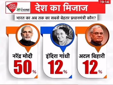 The survey questioned respondents on the best Prime Minister the country has witnessed so far. 50% chose Narendra Modi, while 12% voted for Indira Gandhi as the finest Prime Minister to date. Atal Bihari Vajpayee also received 12% as the best PM.