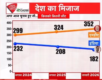 If the Lok Sabha elections were held today, the National Democratic Alliance (NDA) would see an increase in seats to 352. Additionally, BJP's seats would rise to 287, positioning it strongly to secure a majority. These outcomes emerge from India Today-C Voter's
