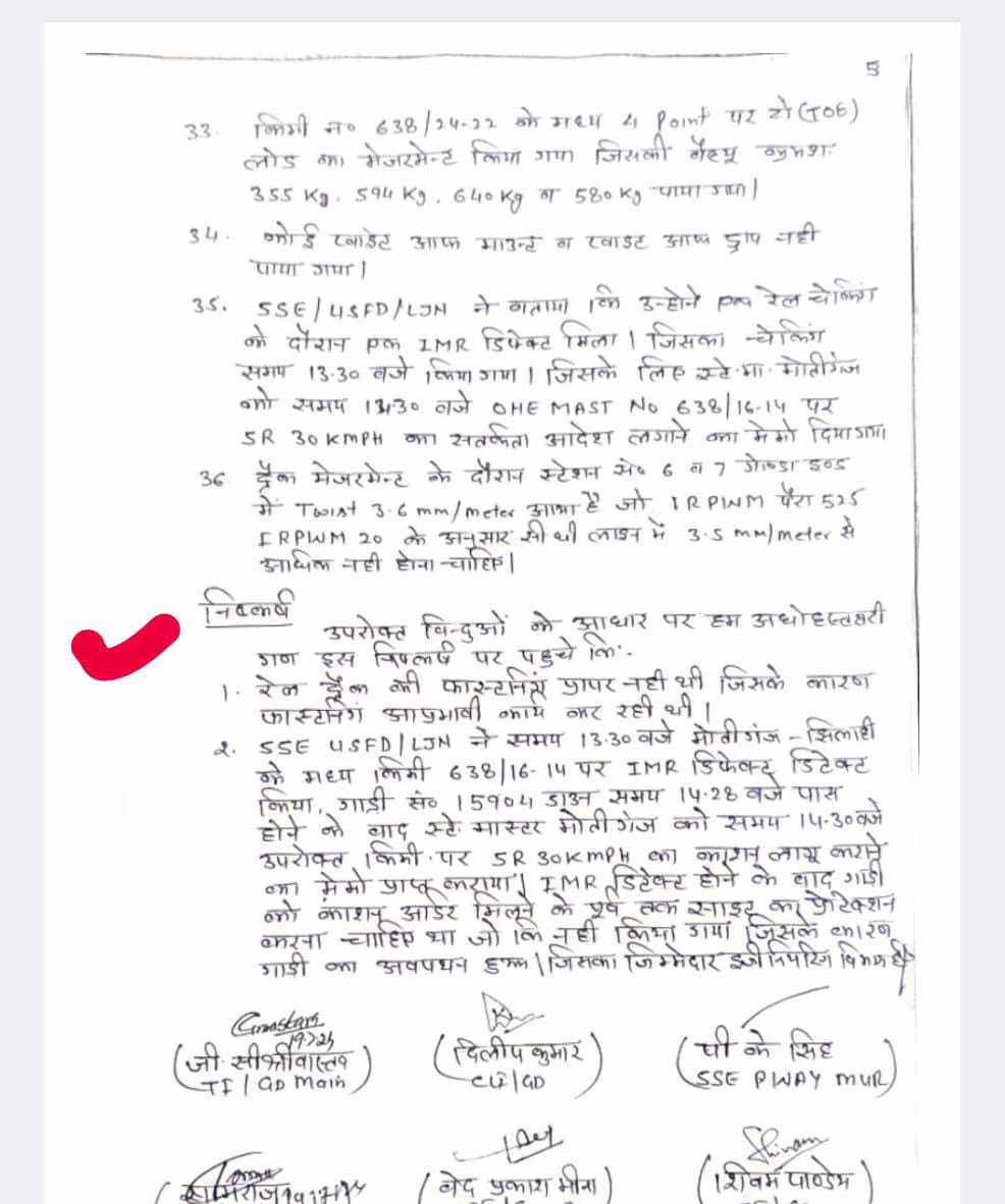 Despite this warning, no cautionary messages were posted on the track, allowing the train to proceed at full speed. Consequently, the Railway's inquiry committee has attributed the accident to the Engineering Department of the Jhilahi section under the Lucknow Railway Division. The report highlights improper fastening of the track, causing it to loosen due to heat expansion.