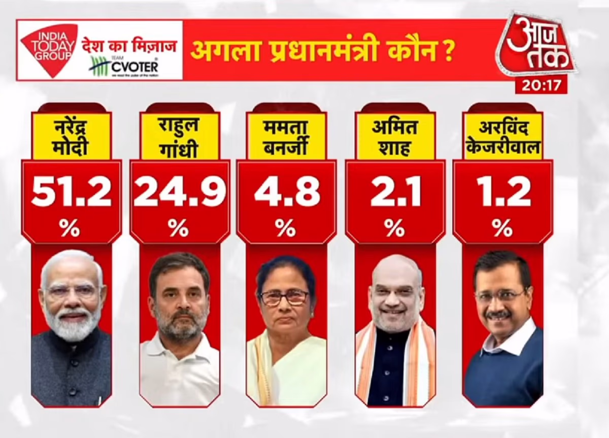 Who stands as the prime candidate for the next Prime Minister if elections were held today? A notable 51.2% favor Narendra Modi, with 24.9% supporting Rahul Gandhi. Meanwhile, 1.2% see Arvind Kejriwal as a future PM.